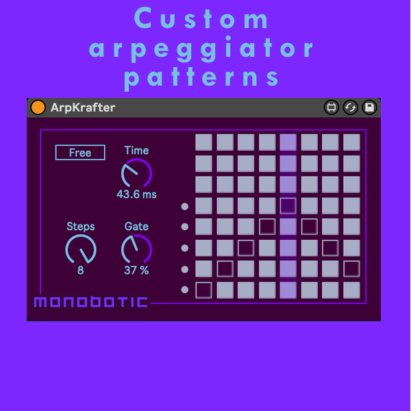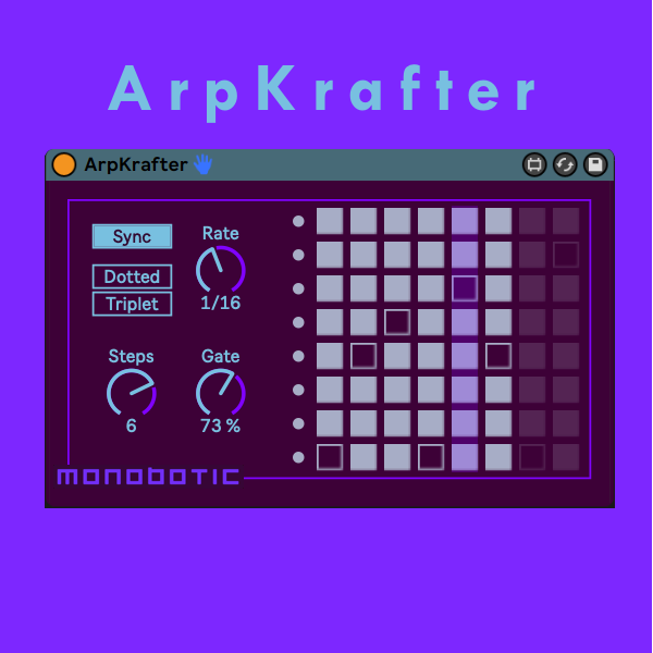 ArpKrafter is a Max-For-Live device similar to Live's arpeggiator device but with customisable style patterns. This device allows for the input of chords with up to 8 midi notes. The notes are arpeggiated according to the steps of the grid pattern.